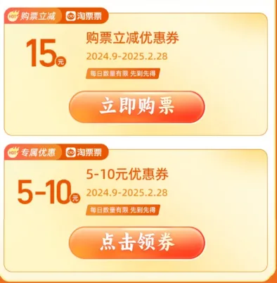 领取限制:优惠券仅当日有效,每位用户在活动期间每周最多参与1次5-10元优惠券购票,每月最多享受一次购票立减15元优惠