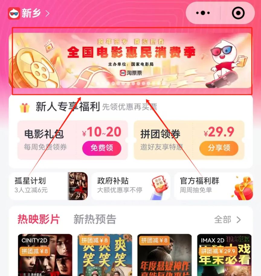 2024年12月9日至2025年2月28日,用户可通过淘票票App、微信淘票票小程序、支付宝淘票票小程序、淘宝淘票票小程序首页“全国电影惠民消费季”或“政府补贴”进入活动专题页领取5—50元红包;