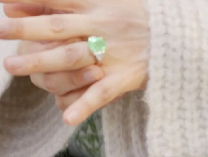 JLO在她个人网站On the JLo宣布订婚消息,画面中也晒出别緻的绿色钻石婚戒。在彩钻的世界里,绿钻被认为是最稀有的色彩之一。準新娘JLO说:(2000年出席葛莱美音乐奖颁奖典礼上穿身着一席绿色印花的Versace礼服,可说是她经典的红毯Looks之一)